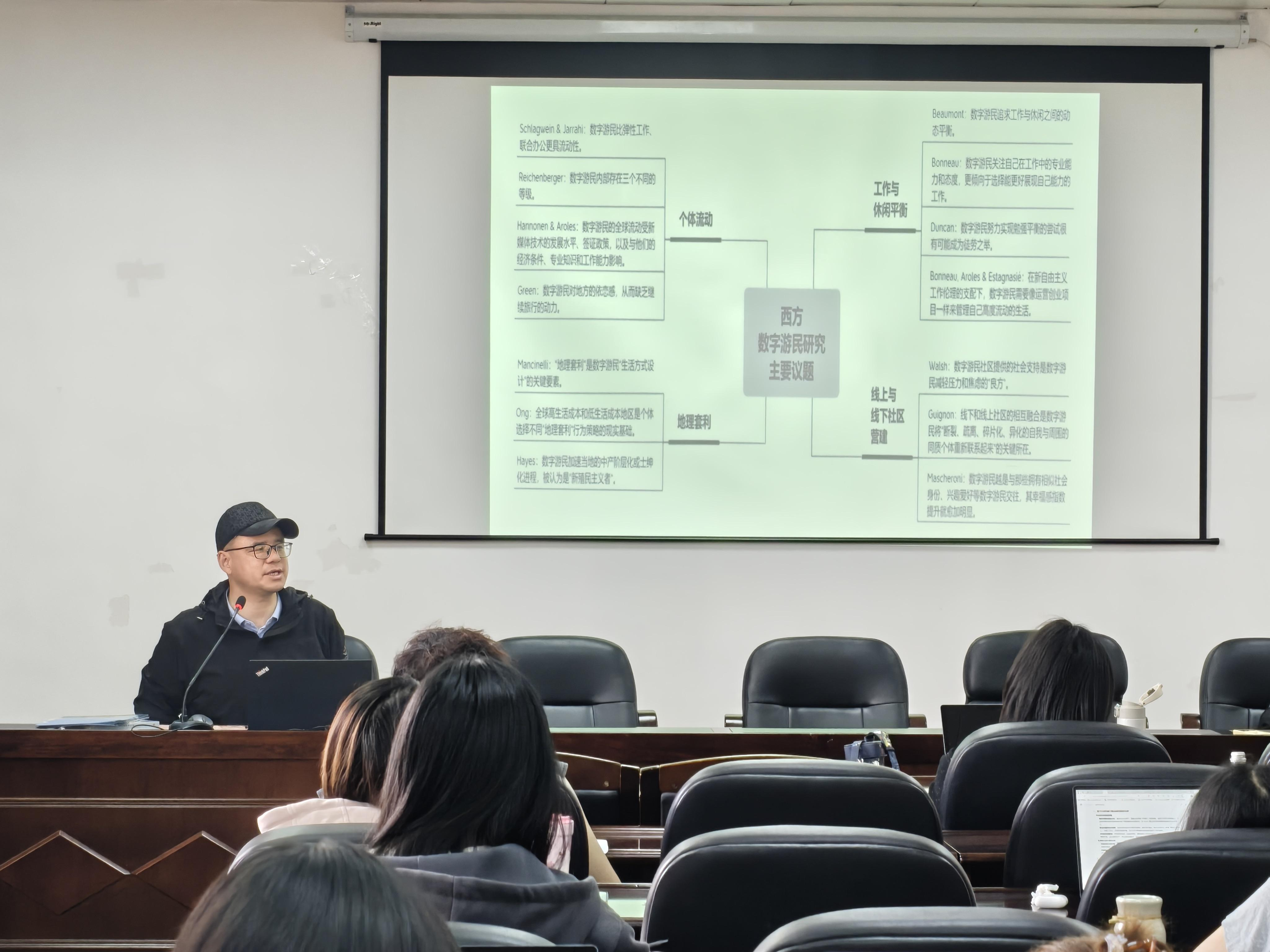近日,复旦大学新闻学院教授、博士生导师姚建华应邀来校开展主题为“数字游民研究的本土化探索”的讲座。传播学院副院长连水兴教授和师生代表到场聆听。姚建华教授对全球数字游民研究进行综述,并分享了大量关于我国数字游民的经验性材料,凝练总结了我国数字游民的生活特征,并就论文写作分享经验,为同学们提供了学术指导。(传播学院)