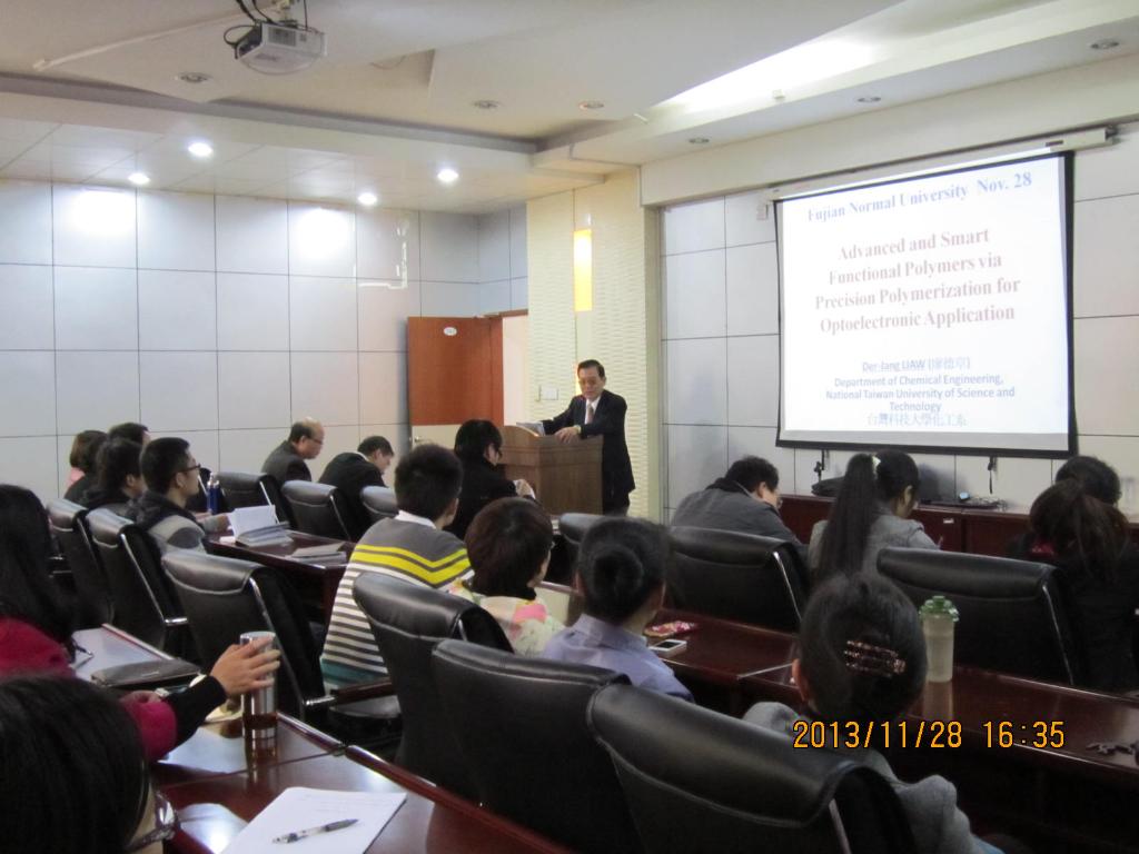 11月28日下午,必一在线平台(中国)官网兼职教授、台湾科技大学讲座教授、俄罗斯国际工程院通讯院士廖德章教授应邀来必一在线平台(中国)官网交流讲学,并做了题为《先进功能材料的精密聚合及光电应用》的学术报告。材料科学与工程学院有关领导、部分教师和全体研究生听取了报告。