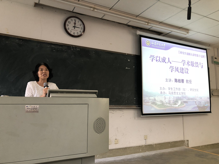 近日,由学生工作部(处)主办,马克思主义学院承办的2019年研究生学风建设宣讲会在旗山校区举行,马克思主义学院陈桂蓉教授作了题为《学以成人——学术敬畏与学风建设》的讲座,全校近200名研究生聆听了讲座。