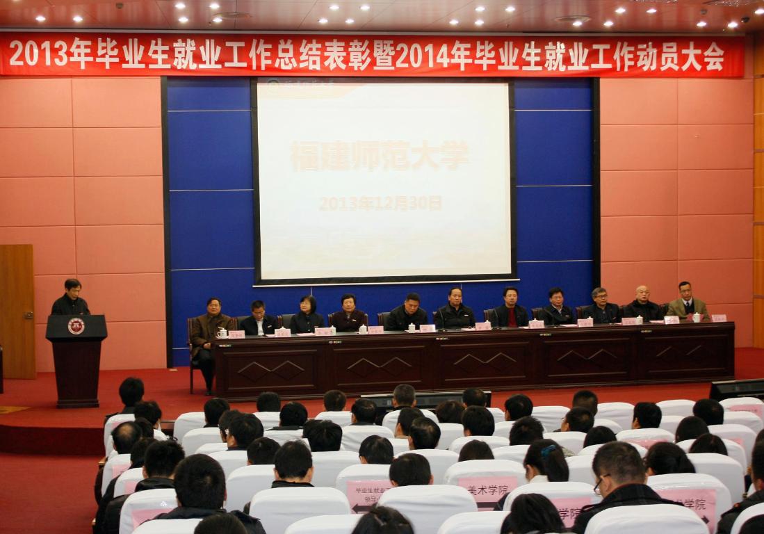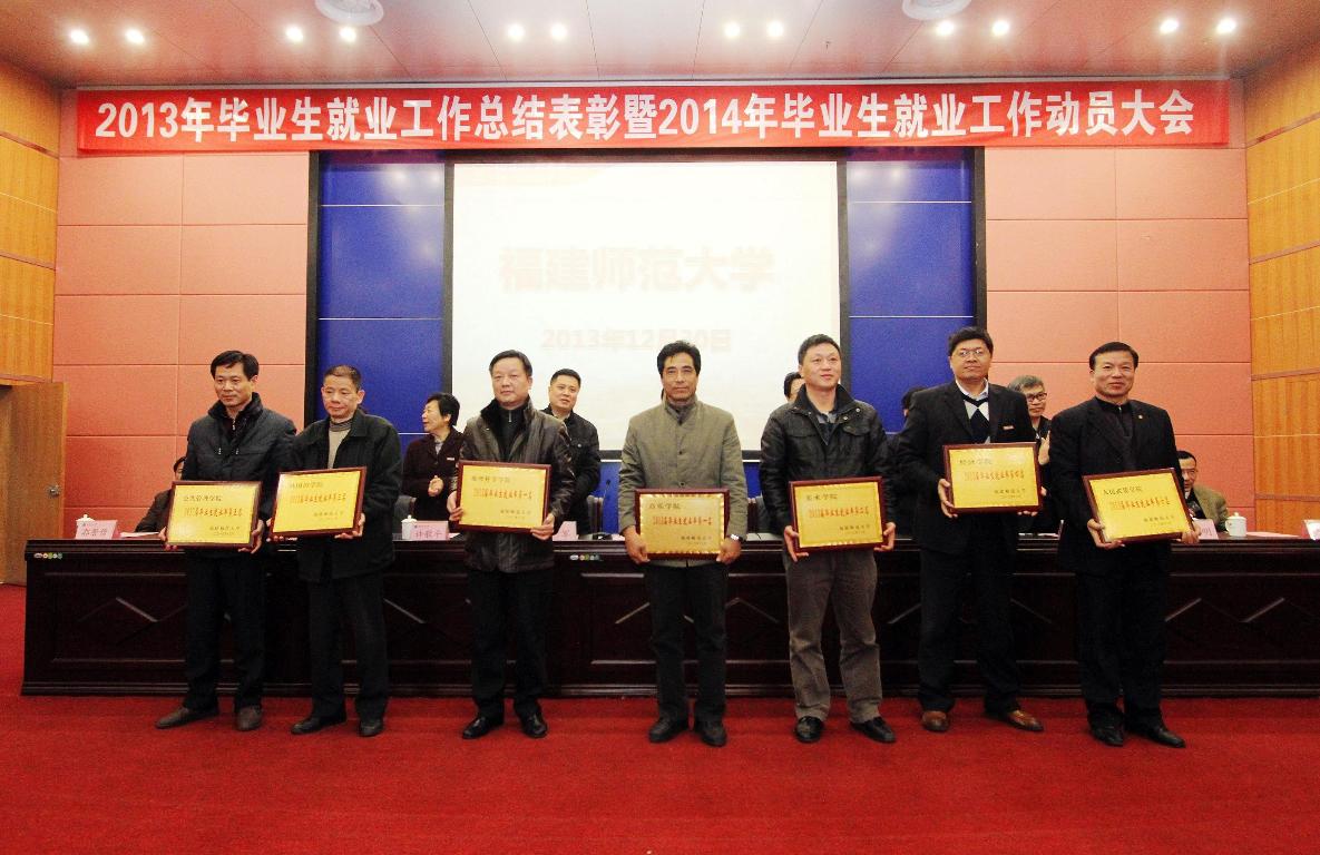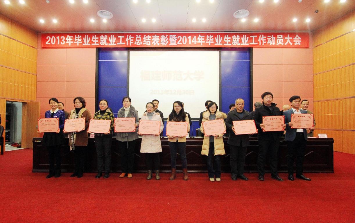 大会对2013年毕业生就业工作先进单位、先进个人进行了表彰。音乐学院、地理科学学院、美术学院、外国语学院、经济学院、公共管理学院、人民武装学院进入本专科毕业生就业率前6名。数学与计算机科学学院、物理与能源学院、材料科学与工程学院、文学院、地理科学学院、环境科学与工程学院进入本专科毕业生签约率前6名。教育学院、文学院、音乐学院、美术学院、地理科学学院、软件学院和环境科学与工程学院获得2013年就业工作创新奖。19个学院毕业研究生就业率达到100%。林菁等19位同志获毕业生就业工作贡献奖,梅煌伟等28位同志获毕业生就业工作先进个人称号。