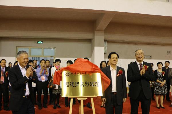 仪式上,林和平书记、郑道溪先生、许明良先生共同为“福建师大游泳馆”揭牌。