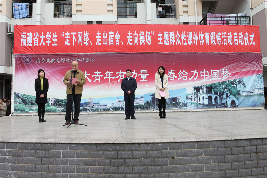 日前,福建省大学生“走下网络、走出宿舍、走向操场”主题群众性课外体育锻炼活动启动仪式在旗山校区举行。团省委副书记兰明尚,必一在线平台(中国)官网副校长许明,省学联主席王薇薇,在榕各高校团委书记、学生会主席、学生社团联合会主席,青年学生代表500人参加了启动仪式。