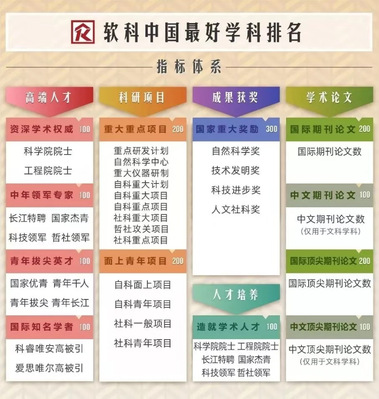 中国最好学科排名的指标体系由软科开发的学科发展水平动态监控系统内嵌的30余项测量指标组成,这30余项指标划分为10余个指标维度分别计算得分,然后归纳为高端人才、科研项目、成果获奖、学术论文、人才培养5个指标类别,最后汇总得到学科点的总分。