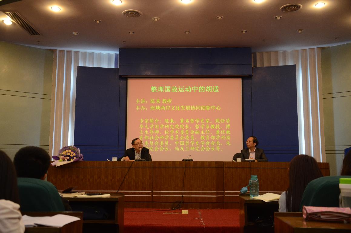陈来教授通过“知识以及学术上的肯定,讲学术与思想分化”、“ 借鉴欧日研究方法,提出用科学方法整理国故”和“启蒙压倒学术,国故不过是往史陈迹,对固有文化丧失信心”三个方面,讲述了胡适在1919到1929年对于整理国故的态度。在两个多小时的报告中,陈来教授以广博的学识、生动的语言和精辟的阐述博得了师生的阵阵掌声。