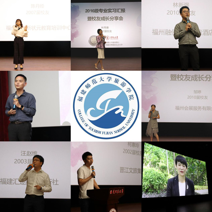10月23日下午,旅游学院在旗山校区星雨剧场举办2016级专业实习汇报暨校友成长分享会。教务处副处长杨发福、各实习单位代表、优秀校友代表、学院全体教师和2016级、2017级同学共300余人参加了活动。