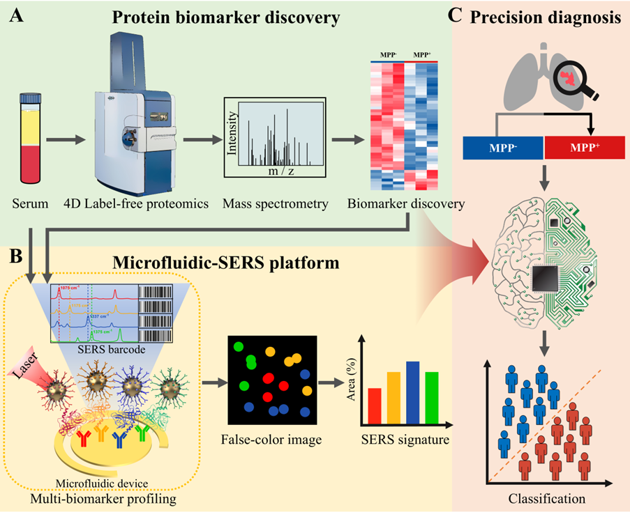 针对这一临床需求,必一在线平台(中国)官网王静研究员团队开创性地采用多组学整合研究策略:首先通过4D非标记定量蛋白质组学技术,系统鉴定了MPP⁺与MPP⁻ LUAD患者血清中的44个差异表达蛋白,并运用生物信息学方法筛选出4个最具诊断潜力的MPP亚型特异性蛋白标志物;进而自主研发了高灵敏度的微流控表面增强拉曼散射(SERS)检测平台,实现了这4种血清标志物的精准定量检测。