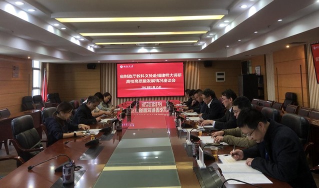 近日,省财政厅教科文处处长陈卉,副处长陈锋、唐文倩一行到校调研学校高质量发展情况。副校长陈庆华,财务处、党政办公室、发展规划处、人事处、资产管理处相关负责人参加了座谈会。
