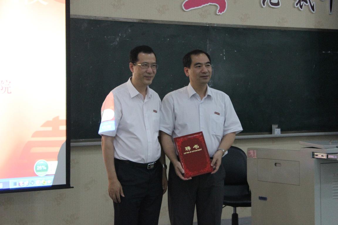 敦聘仪式于6月18日下午在旗山校区名师讲堂举行。王长平副校长、光电与信息工程学院负责同志及师生代表300多人出席了仪式。王长平代表学校致辞并向龚旗煌院士颁发了聘书和佩戴校徽。