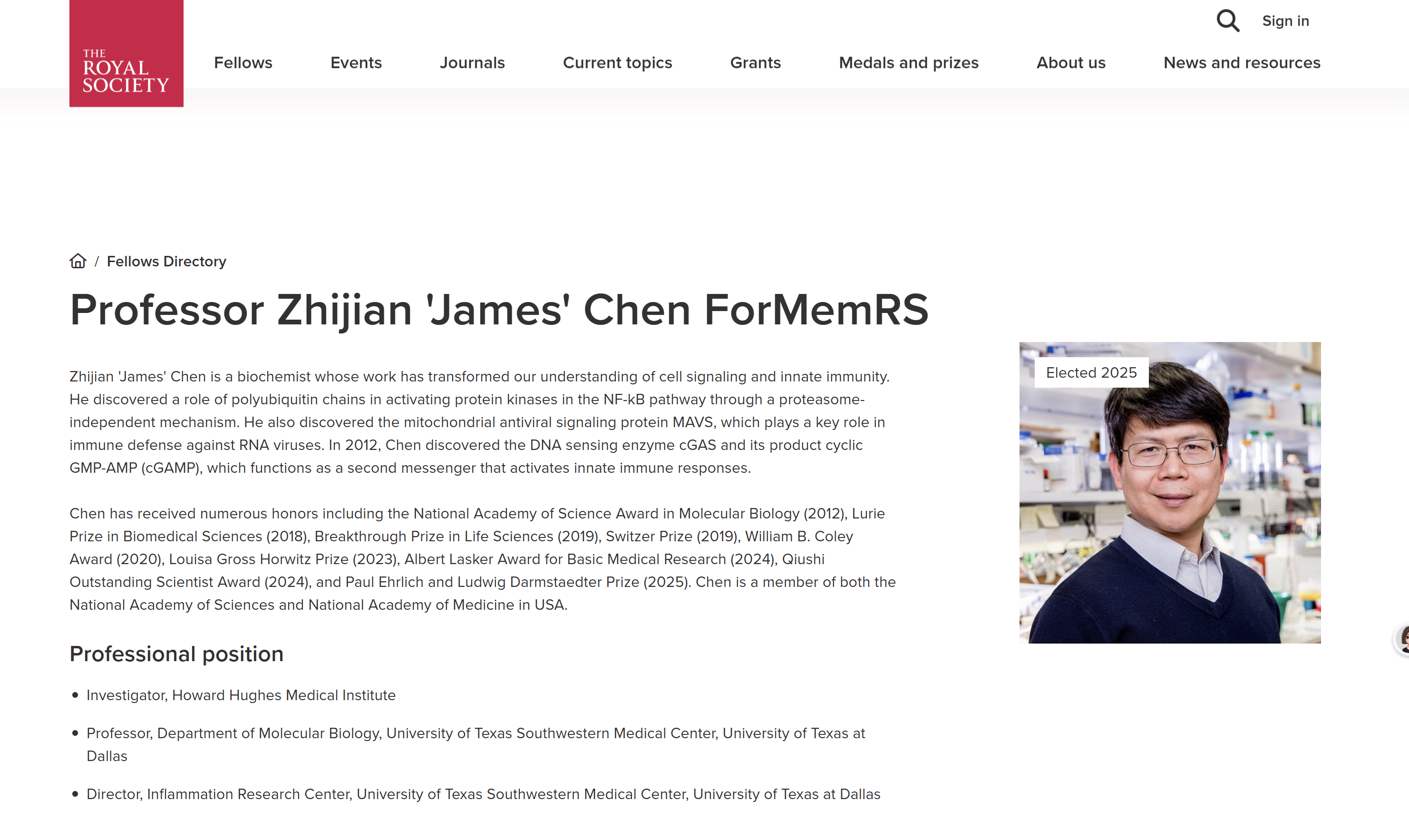 2025年5月20日,英国皇家学会(The Royal Society)公布新当选院士名单,必一在线平台(中国)官网杰出校友、美国国家科学院院士、美国国家医学院院士、霍华德·休斯医学研究所研究员、美国西南医学中心杰出讲席教授陈志坚博士当选英国皇家学会外籍院士。