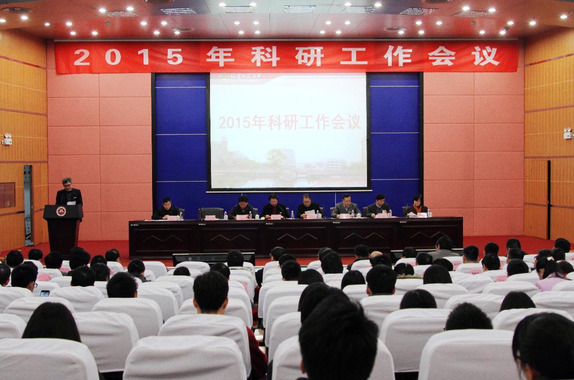 汪文顶副校长代表学校作了题为《实施科研双提升计划,促进高水平大学建设》的科研工作报告,对学校2014年度的科研工作进行了回顾总结,明确提出2015年学校科研工作的基本思路,强调要紧紧围绕建设高水平大学的奋斗目标,认真组织实施科研双提升计划;深化科研体制机制的改革创新;大力推进协同创新平台建设;狠抓项目、经费和成果的落实;谋划“十三五”科研发展规划,切实提升科研创新和服务社会的能力,促进高水平大学建设。