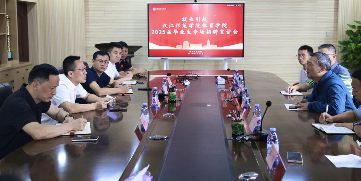523日,汉江师范学院体育学院院长肖嵘一行来体育科学学院开展2025届毕业生专场招聘宣讲会。体育科学学院学院院长许文鑫、党委副书记罗毅、公共体育教研部副主任魏德样以及2025届博士毕业生参加宣讲会。