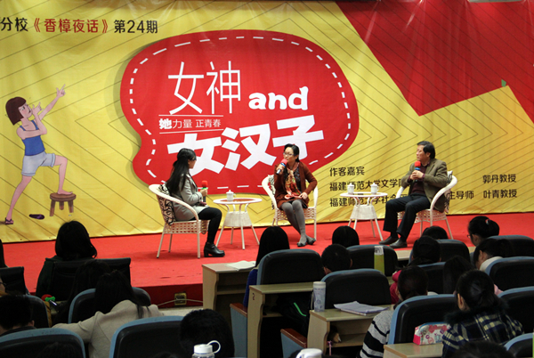 在校园文化品牌活动《香樟夜话》的现场,文学院教授、分校文法学院兼职教授郭丹与社会历史学院教授叶青,为师生解读“女神和女汉子”现象。希望同学们勤练内功,“做内外兼修的新世纪大学生,释放青春正能量”,“做一名和谐发展的人”。