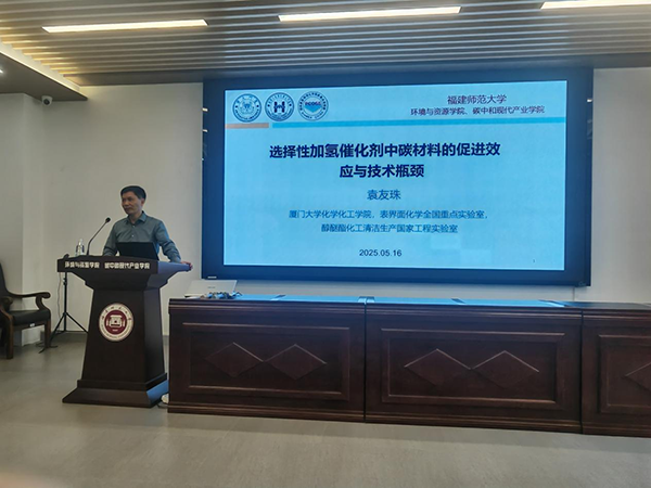 516日上午,厦门大学特聘教授袁友珠受邀来校环境资源学院师生开展选择性加氢催化剂中碳材料的促进效应与技术瓶颈专题讲座。讲座由环境与资源学院副院长杨民权主持