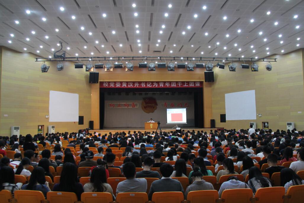 团课伊始,与会师生共同对着团旗宣誓,重温了入团誓词。随后,全场师生一同观看了短片《小葵说之我家书记不一般》,“小葵工作室”以学生喜欢的形式,从“暖男”、“学霸”等视角为同学们介绍了一个认真负责、和蔼亲民的黄汉升书记,深受学生喜欢。