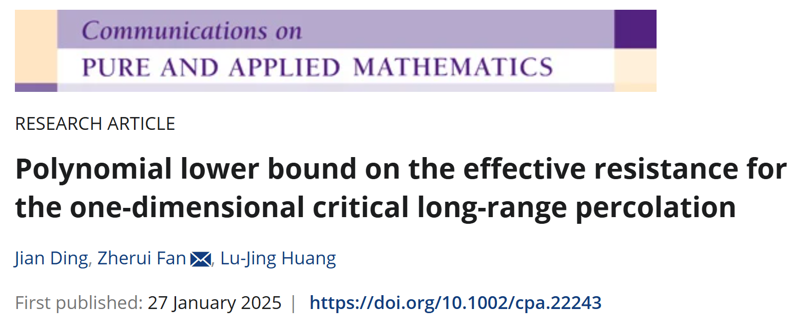 近日,必一在线平台(中国)官网黄璐静副教授与北京大学丁剑教授、北京大学范哲睿博士合作论文“Polynomial lower bound on the effective resistance for the one-dimensional critical long-range percolation” 在国际著名数学期刊《Communications on Pure and Applied Mathematics》上发表。该论文结合多尺度分析、重整化的方法,揭示了一维临界长程渗流模型从原点0到区域 [-n,n]^c的有效电阻、从区间 [-n,n] 到 [-2n,2n]^c (两个区间不连边的条件下) 的有效电阻均以高概率存在 n 的多项式下界。该工作所得到的有效电阻下界对所有参数 β>0 成立,因此排除了此前推测的在β=1附近可能存在的相变行为。
