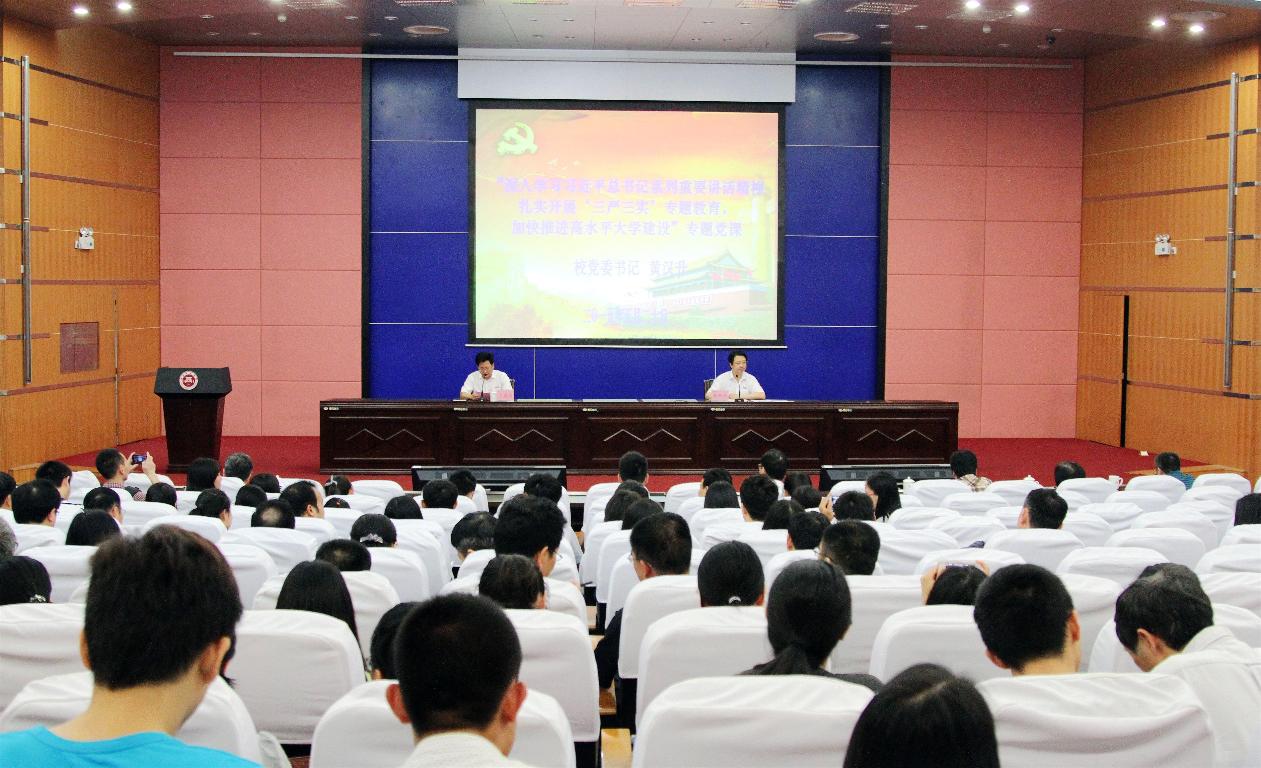 黄汉升结合中央精神和学校干部队伍实际,对“三严三实”的本真内涵和实践要求进行了解读,指出要坚持严以修身,坚定理想信念,追求高尚情操;坚持严以用权,自觉接受监督,规范行使权力;坚持严以律己,心存敬畏之心,树立清廉形象;牢记谋事要实,尊重客观规律,科学谋划发展;牢记创业要实,强化责任担当,勇于干事创业;牢记做人要实,对党忠诚老实,为人公道正派。要求全校党员干部尤其是领导干部时刻铭记、自觉践行,对照“三严三实”修身做人,对照“三严三实”严以用权,对照“三严三实”干事创业,切实以过硬作风树形象、聚民心、促发展。