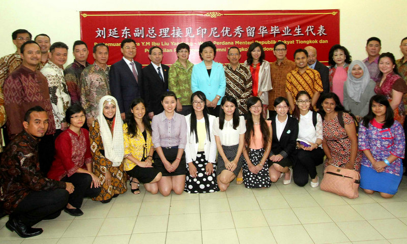 刘延东称赞韩妮汉语说的好,并亲切地对韩妮和在场的学生说,中国政府欢迎更多的印尼青年来华留学交流,同时也鼓励中国青年到印尼留学。刘延东指出,今年是中印尼建交65周年,在双方的共同努力下,两国关系进入历史最好时期。希望两国青年勇于担当、奋发有为、自觉担负起促进两国友好合作的崇高使命,为促进不同文明交流互鉴、维护世界和平与发展作出新的贡献。