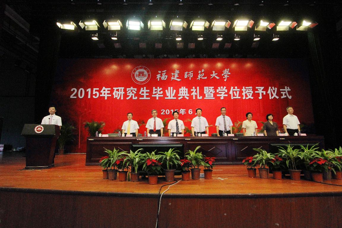 典礼仪式上,王建南副书记宣读了2015届优秀毕业研究生名单;李敏副校长宣读了2014年冬季、2015年夏季获博士、硕士学位研究生名单。中国建设银行福州城东支行行长杨达远博士代表校友发言,马克思主义学院范雪莹同学代表全体毕业研究生发言,张寅仁先生代表毕业研究生亲友发言。全体毕业研究生收看了校研究生会专门为他们制作的《别师大•聚天涯》视频,抒发深深的离别情怀。