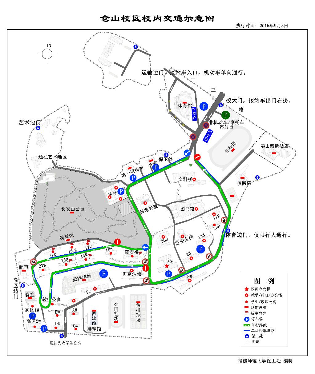 (三)小东门(明德路),星槎桥门,仓山大道北段,明德路,溪源路北段实行单向通行,北部生活区西门禁止机动车通行,请严格按交通示意图行驶,严禁逆向行驶。
