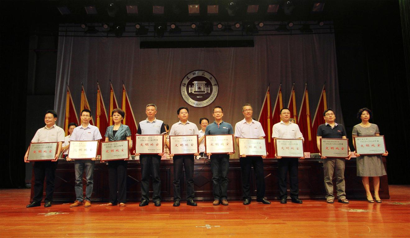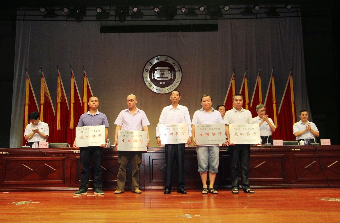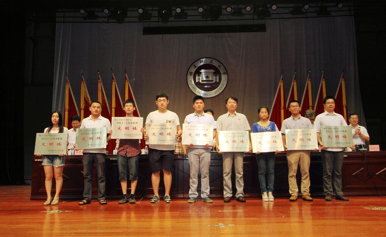 汪文顶副校长宣读了表彰名单。主席台领导为获奖单位代表和个人颁奖。会议表彰了2013-2014年度精神文明建设先进集体和个人、2014年度新闻宣传工作先进单位、2014年度校报信息工作先进个人和优秀学生记者。经济学院等10个学院荣获“文明学院”称号,学校办公室等10个部处荣获“文明处室”称号,李苑7(教育学院)等10座楼宇荣获“文明楼”称号,李苑7-209等90间学生宿舍荣获“文明宿舍”称号,随园餐厅等5个餐厅荣获“文明餐厅”称号,黄一菁、刘聃等30名师生荣获“精神文明建设先进个人”称号,协和学院等12个单位荣获“新闻宣传先进单位”称号,王源等5位教师荣获“校报信息先进个人”称号,