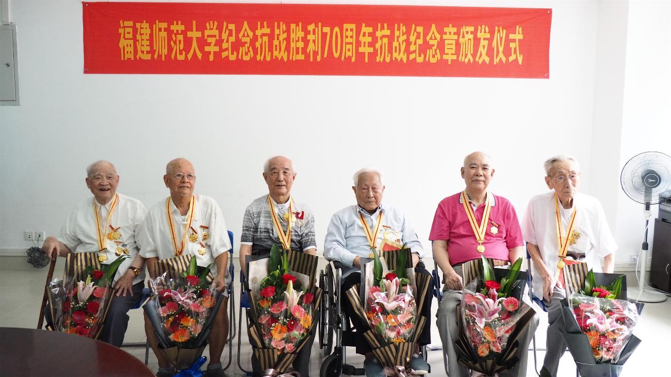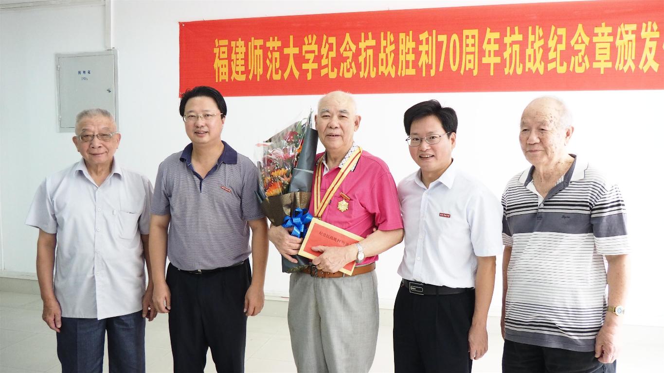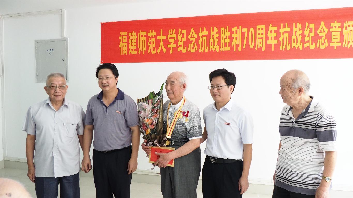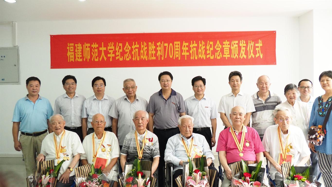 近日,学校在仓山校区隆重举行纪念抗战胜利70周年纪念章颁发仪式。校领导黄汉升、王建南,抗战老战士、老同志张次愚、张同伦、刘春游、王勤、寇良华、段双林等同志,以及学校办公室、组织部、宣传部、离休干部党总支、离退处等部门负责人40多人出席仪式。仪式由王建南副书记主持。