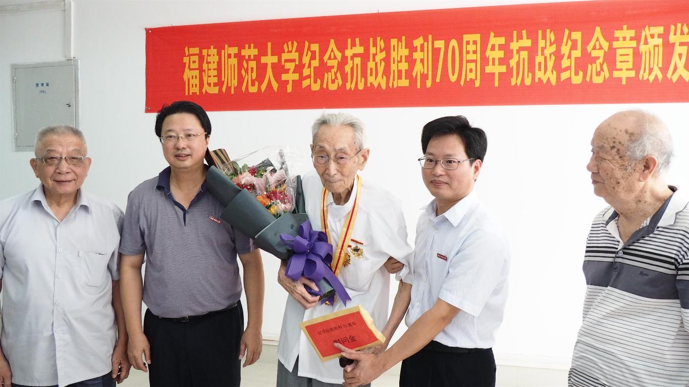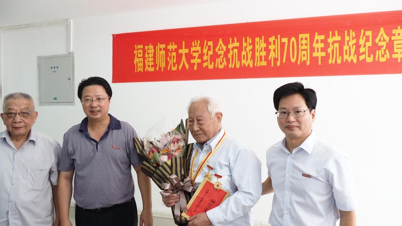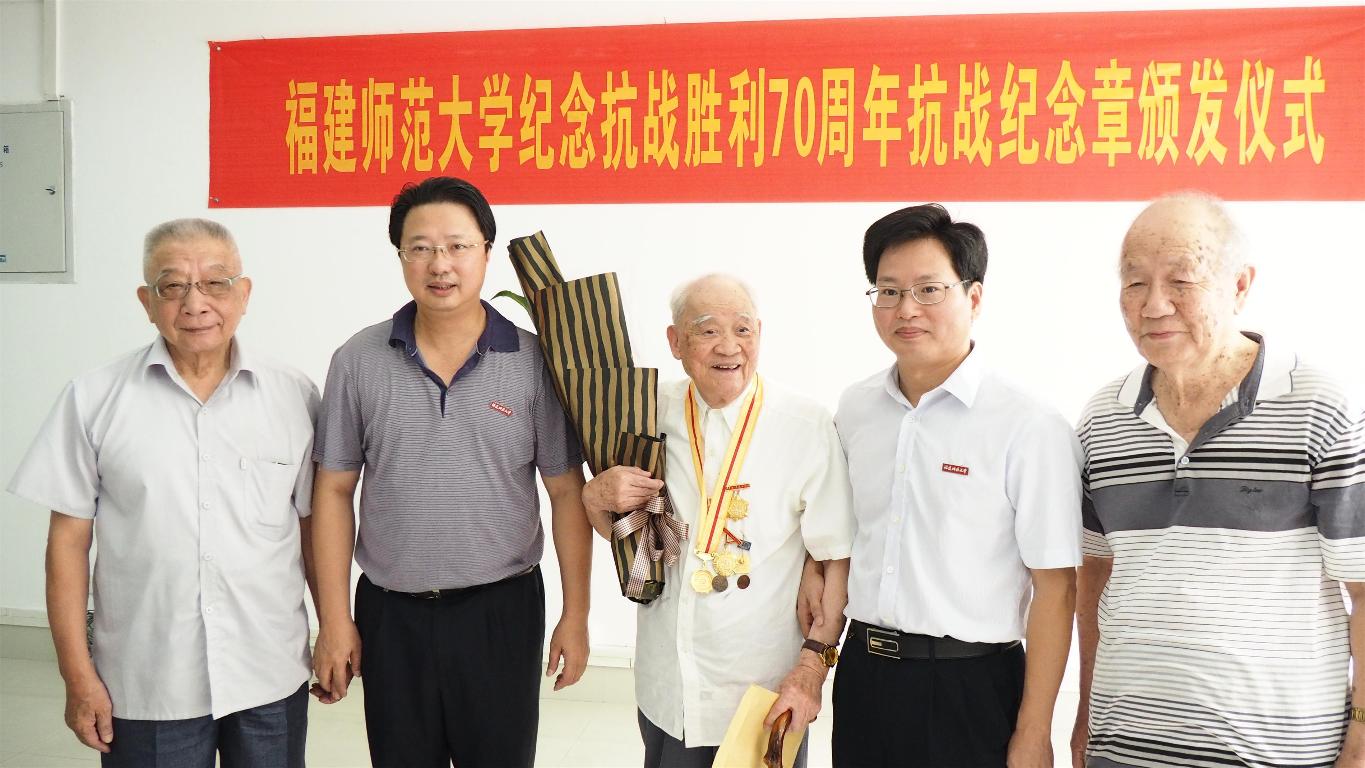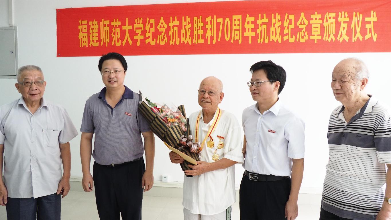 近日,学校在仓山校区隆重举行纪念抗战胜利70周年纪念章颁发仪式。校领导黄汉升、王建南,抗战老战士、老同志张次愚、张同伦、刘春游、王勤、寇良华、段双林等同志,以及学校办公室、组织部、宣传部、离休干部党总支、离退处等部门负责人40多人出席仪式。仪式由王建南副书记主持。
