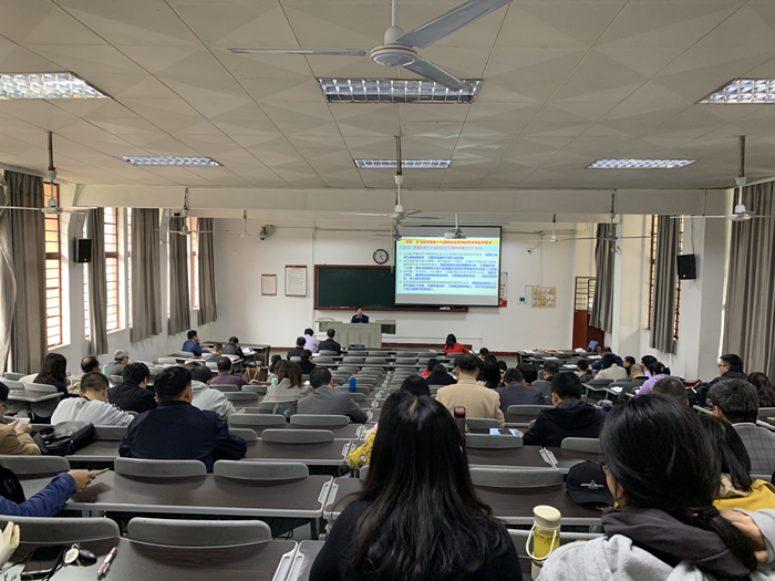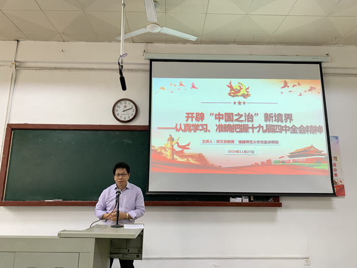 11月27日下午,文学院党委邀请校党委讲师团成员、马克思主义学院郑又贤教授为全院师生作《开辟“中国之治”新境界——认真学习、准确把握十九届四中全会精神》专题宣讲。学院党政领导、全体教职工、师生党支部书记和支部委员近百人参加专题报告会。报告会由学院党委书记李建华主持。