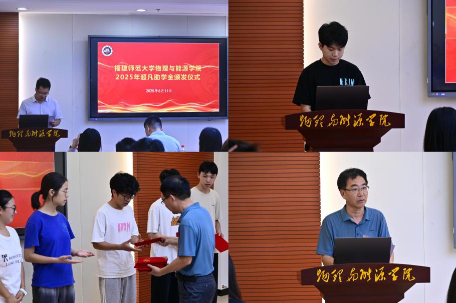 近日,物理与能源学院在科技楼举行2025年超凡助学金发放仪式。学院党委书记林玉辉、副书记阮学旺、全体辅导员及2025年超凡助学金获得者参加。