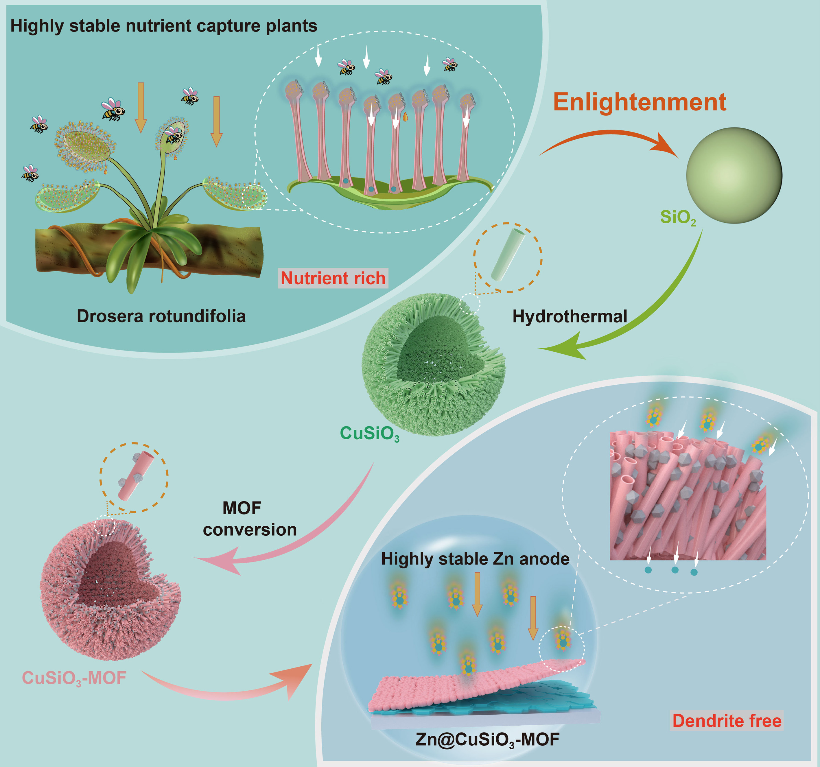 为解决这些挑战,必一在线平台(中国)官网赵毅研究员团队从圆叶茅膏菜的生物机制和共生结构中汲取灵感,提出了一种原位MOF转化构建的分级中空CuSiO3-MOF杂化材料。这种仿生杂化材料作为锌负极人工保护层,可为锌负极提供优异的结构稳定性、丰富的亲锌位点、强大的去溶剂化能力和快速的离子迁移能力,从而实现高度稳定的无枝晶锌沉积/剥离过程,并有效抑制与水相关的副反应。在低电流密度下,Zn@CuSiO3-MOF对称电池展现出超过3500小时的超长循环寿命。即使在45%和90%的高放电深度下,该电池仍分别保持1200小时和400小时的稳定循环性能,显著优于大多数已报道的MOF修饰负极。此外,以MnO₂和C@V₂O₃为正极的全电池表现出卓越的循环性能和倍率性能,进一步凸显Zn@CuSiO3-MOF负极在电网储能和可穿戴电子设备中的实际应用潜力。这一仿生策略为构建稳定MOF基杂化材料用于高性能锌金属负极提供了一种可行的方法。研究成果以“A Biomimetic Copper Silicate-MOF Hybrid for Highly Stable Zn Metal Anode”为题,发表于材料顶级期刊《Advanced Materials》。
