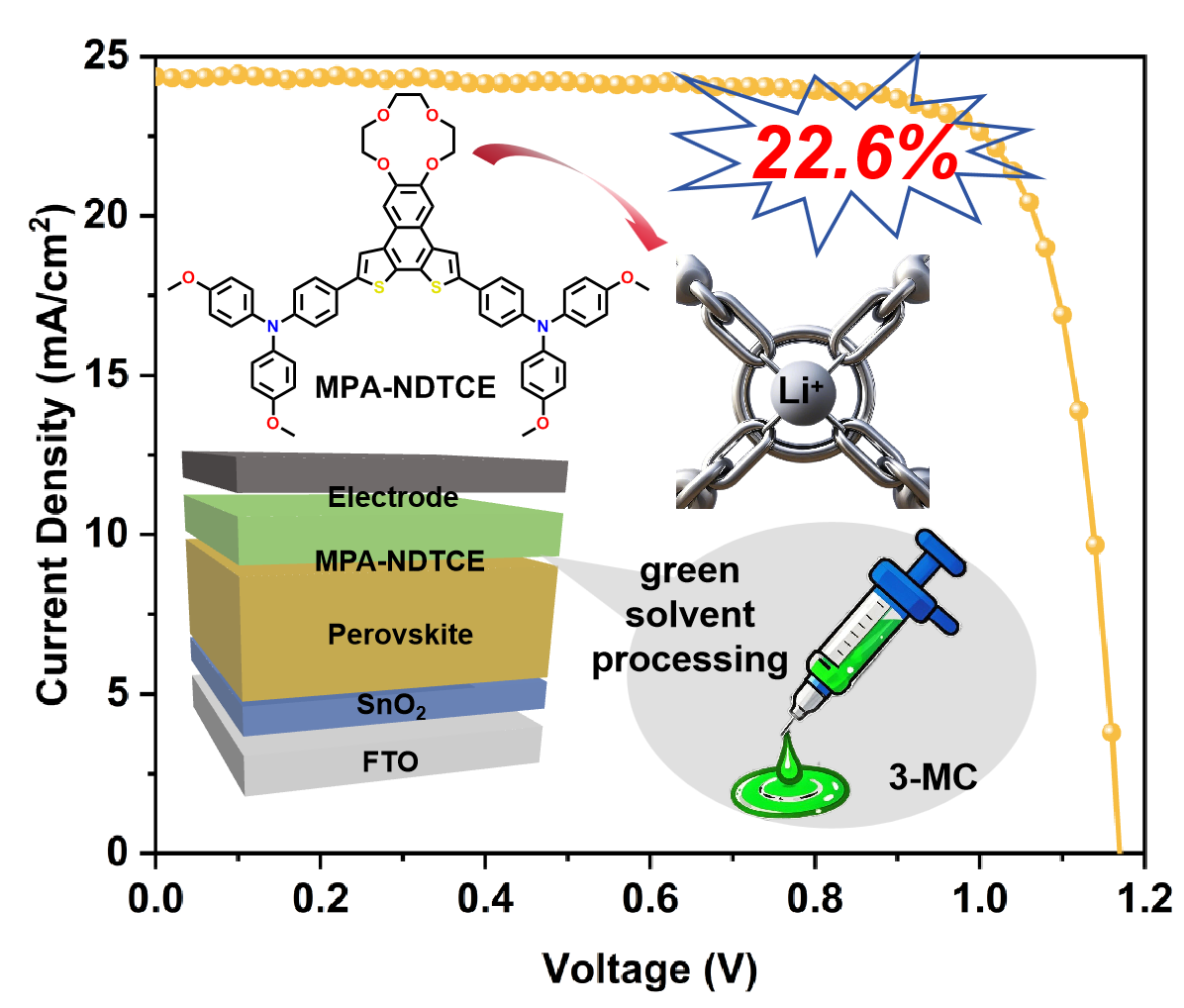 针对上述问题,必一在线平台(中国)官网海峡柔性电子(未来科技)学院王漾教授、安明伟副教授以及中科院福建物质结构研究所高鹏研究员设计了一种含有冠醚结构的空穴传输材料MPA-NDTCE,通过冠醚与锂离子之间较强的络合作用可以有效抑制锂盐聚集与锂离子的迁移,从而提升空穴传输层的形貌稳定性。值得注意的是,冠醚侧链的高极性赋予MPA-NDTCE在绿色溶剂(如3-甲基环己酮)中优异的溶解性和成膜性,从而避免了传统卤化溶剂(如氯苯)的使用。基于该新型空穴传输材料的钙钛矿太阳能电池最终实现了22.6%的最大能量转换效率,展现了其在高性能与环保加工协同优化方面的潜力。该项工作以“Design of Ionic Lock Structure for tBP-Free and Green-Solvent Processed Hole Transporter in Perovskite Solar Cells”为题发表在期刊ACS Sustainable Chemistry & Engineering上。