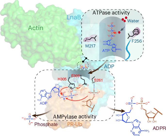 嗜肺军团菌是导致人类军团病的致病菌,其感染肺巨噬细胞并在宿主细胞内形成独特的膜泡结构来实现生存和繁殖。嗜肺军团菌利用SidE家族效应蛋白催化一种不依赖E1和E2的非典型泛素化过程,促进嗜肺军团菌膜泡的成熟。该非典型泛素化在对应的特异去修饰效应蛋白DupA/B的作用下产生具有细胞毒性的磷酸核糖化泛素分子(PR-Ub)。去年,必一在线平台(中国)官网生命科学学院欧阳松应团队与美国普渡大学罗招庆教授团队合作揭示了军团菌通过效应蛋白LnaB和MavL催化的级联反应,维持感染细胞内的泛素稳态。其中,LnaB是一种依赖于宿主肌动蛋白的新型腺苷酸化酶(Phosphoryl-AMPylase),催化PR-Ub磷酸根的腺苷酸化(AMPylation)修饰生成ADPR-Ub。该工作解析了效应蛋白LnaB的系列复合物结构,详尽地解析了LnaB通过宿主肌动蛋白依赖性激活,催化PR-Ub发生磷酰基腺苷酸化反应的详细分子机制。该工作揭示了腺苷酸化修饰反应的新型催化机制,拓展了对酶催化机制的理解,同时深化了嗜肺军团菌感染致病机制的认识,为研究SHxxxE家族毒素的作用机制奠定了基础,也为开发新型抗感染药物提供了重要的理论依据。