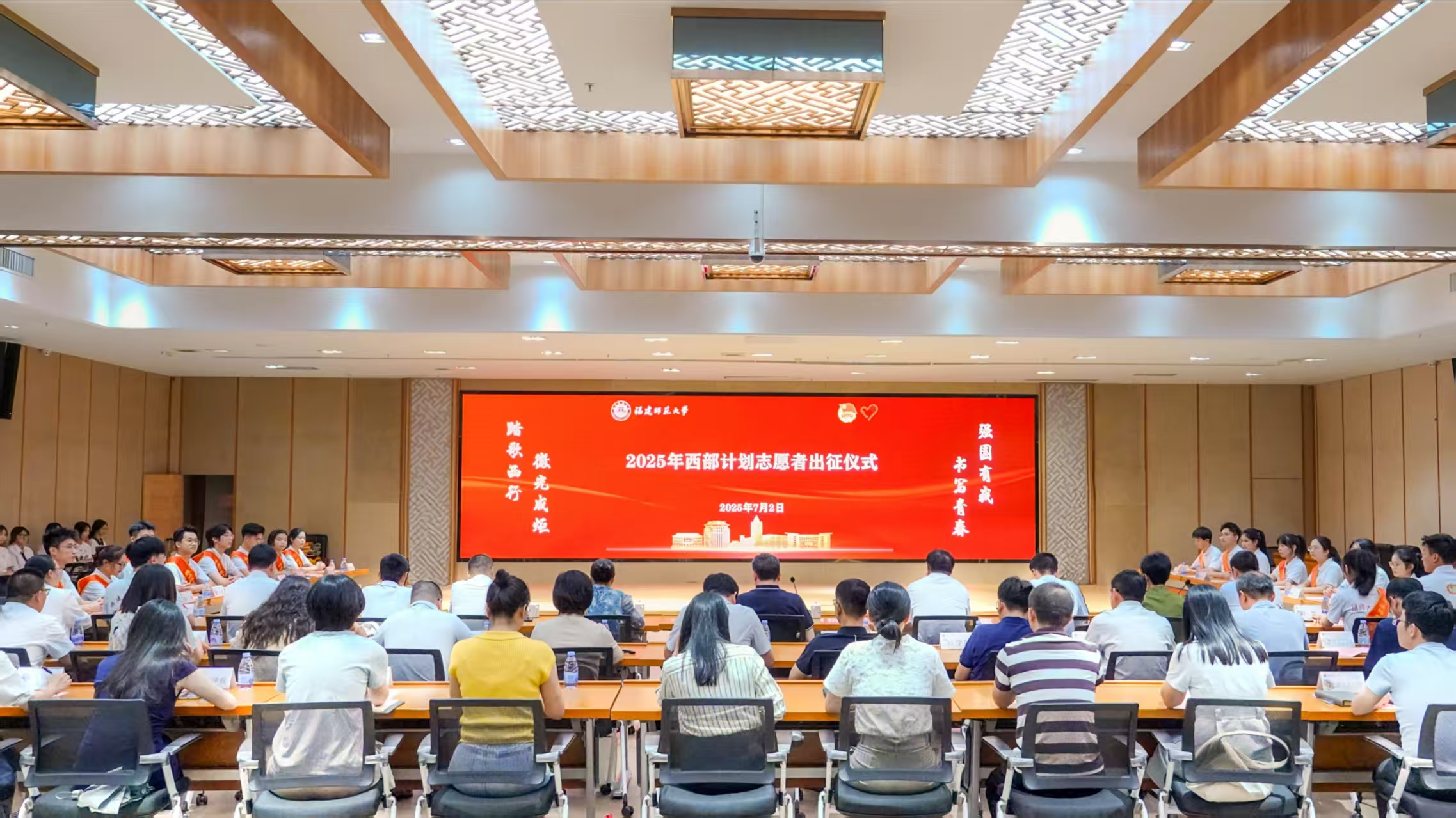 吴剑锋为校西部计划志愿者、研究生支教团代表发放出征礼包、授旗并作动员讲话。他希望青年学生们要筑牢信仰之基,让理想在基层沃土中扎根铸魂,把“小我”融入“大我”心怀家国天下,勇担青春使命;要锤炼实干之能,让青春在实践熔炉中淬炼成钢,把社会实践和志愿服务作为能力培养、知识探索的重要契机,用脚步丈量祖国大地,以实干担当擦亮青春底色;要砥砺品格之本,让人生在真诚奉献中绽放华彩,用青年的智慧和热情为服务地注入新活力,在西部大地上奋力书写不负时代、不负青春的精彩答卷。