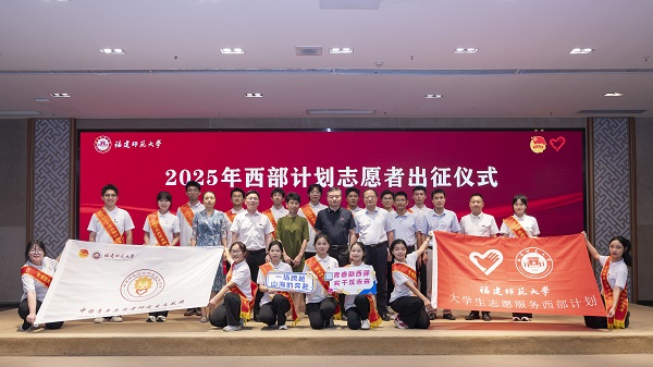 出征仪式于7月2日在旗山校区举行,副校长吴剑锋,组织部、宣传部、学生工作部、教务处、研究生院、机关党委、校团委负责人,相关学院分管学生工作负责人、团委负责人,2024、2025年西部计划志愿者代表参加。