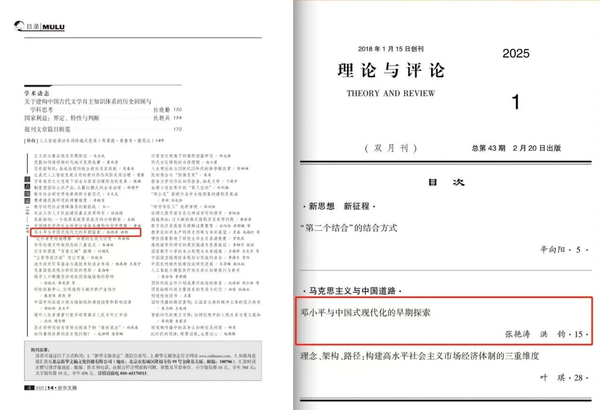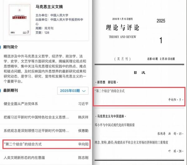 近日,《理论与评论》2025年第1期刊发的《“第二个结合”的结合方式》一文被人大复印报刊资料(《马克思主义文摘》2025年第3期)全文转载;《邓小平与中国式现代化的早期探索》一文获《新华文摘》2025年第14期论点摘编,展现了《理论与评论》在办刊质量上的持续进步。