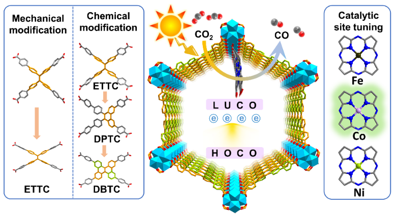 近日,必一在线平台(中国)官网张亮亮副教授课题组合成了一种基于四苯乙烯的柔性Zr-MOF(PCN-128),并以PCN-128为平台展开化学与机械双重改性修饰,期望提升材料在光催化CO2还原活性。机械力诱导压致变色行为,而连续的合成后环化反应扩展了PCN-128内芳香配体的π共轭,将PCN-128转化为PCN-130,显著调节了材料的能带结构与可见光吸收能力。在整个PSM过程中实现了单晶到单晶的转变,为深入理解构效关系提供了重要依据。此外,将金属酞菁的羧基配体(M-TcPC,M=Fe、Co、Ni)引入框架中,提供了额外的催化位点,进一步提高了CO2还原活性。通过优化光敏剂与催化位点的比例,改性催化剂在可见光照射下实现了高达838μmol·g-1·h-1的CO2还原速率。本研究强调了柔性MOFs材料机械和化学改性的潜力,系统揭示了MOFs柔性在能带调控与催化性能优化中的关键作用,为柔性MOFs材料在太阳能转化与可持续能源发展中的应用提供了新思路。该工作以“Chemical and Mechanical Modifications of Flexible Metal-Organic Frameworks for Enhancing Photocatalysis”为题发表于Chemical Science上。