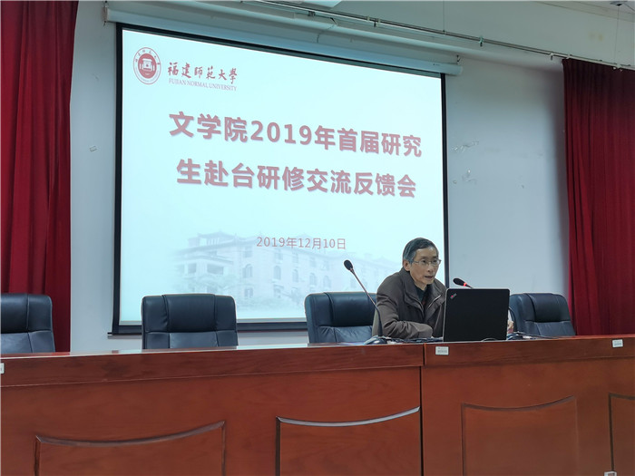 活动于12月10日下午在邵逸夫楼二层多功能厅举行。文学院领导李建华、李彬源、叶祖淼,台湾师范大学研修团队带队老师江震龙、高雄师范大学研修团队带队老师庞壮城,以及文学院2019年赴台研修的46名研究生参加反馈会。