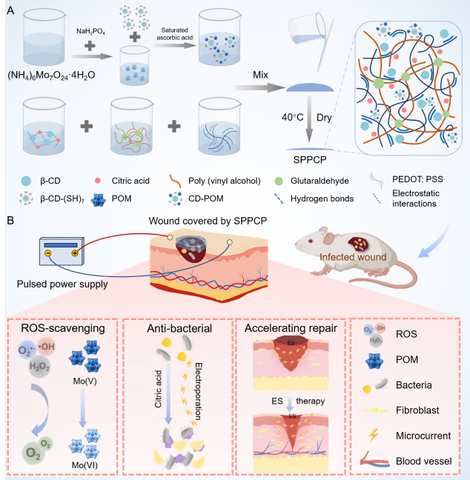 慢性创面因细菌感染和氧化应激常出现愈合缓慢、炎症反复等问题,已成为临床创面管理中的重大挑战。近日,必一在线平台(中国)官网杨震教授团队提出了一种多功能柔性导电凝胶敷料(SPPCP),该敷料由聚乙烯醇、导电高分子PEDOT: PSS、β-环糊精–柠檬酸超分子网络以及多金属氧酸盐(CD-POM)协同构建,具备优异的机械柔韧性、稳定的导电性和出色的组织黏附性。CD-POM赋予敷料高效的活性氧清除能力,可有效缓解氧化应激,诱导巨噬细胞向抗炎M2表型极化,并降低促炎因子水平,为组织修复创造有利的微环境。SPPCP在电刺激协同作用下,对大肠杆菌和金黄色葡萄球菌的抗菌效率超过99%,并可促进成纤维细胞的迁移与增殖。在动物感染性创面模型中,SPPCP联合电刺激疗法不仅能够减轻炎症、促进组织再生,加快血管生成,并促进胶原沉积与肉芽组织形成,从而加速创面修复进程。本研究提出了“电刺激+氧化还原调控”的新型设计策略,可动态优化创面微环境,为新一代柔性电子伤口敷料的开发提供了重要思路。研究成果以“Synergistic Supramolecular Conductive Dressing Integrating Electrical Stimulation and Polyoxometalate Antioxidants for Enhanced Chronic Wound Healing”为题,发表于中科院医学一区TOP期刊《Acta Biomaterialia》。