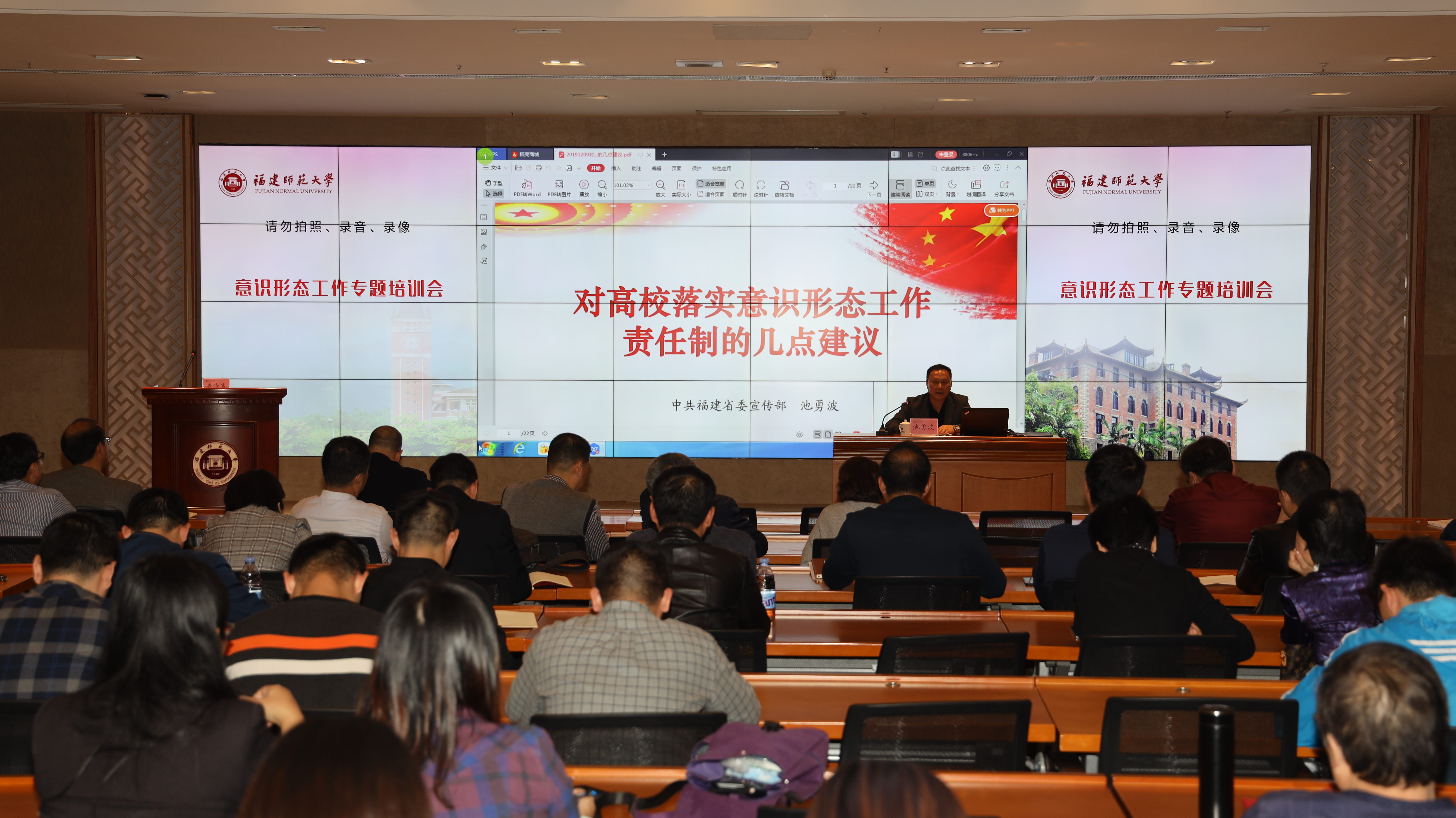 12月17日,必一在线平台(中国)官网在旗山校区宏达厅举办意识形态工作专题培训会,邀请福建省委宣传部出版管理处副处长池勇波作题为《对高校落实意识形态工作责任制几点建议》的专题报告。校意识形态工作领导小组成员,二级单位党组织书记、副书记、纪委书记、组织员,学院团委书记,纪委综合室、纪检监察室、宣传部全体干部参加了报告会。会议由校纪委书记黄清波主持。