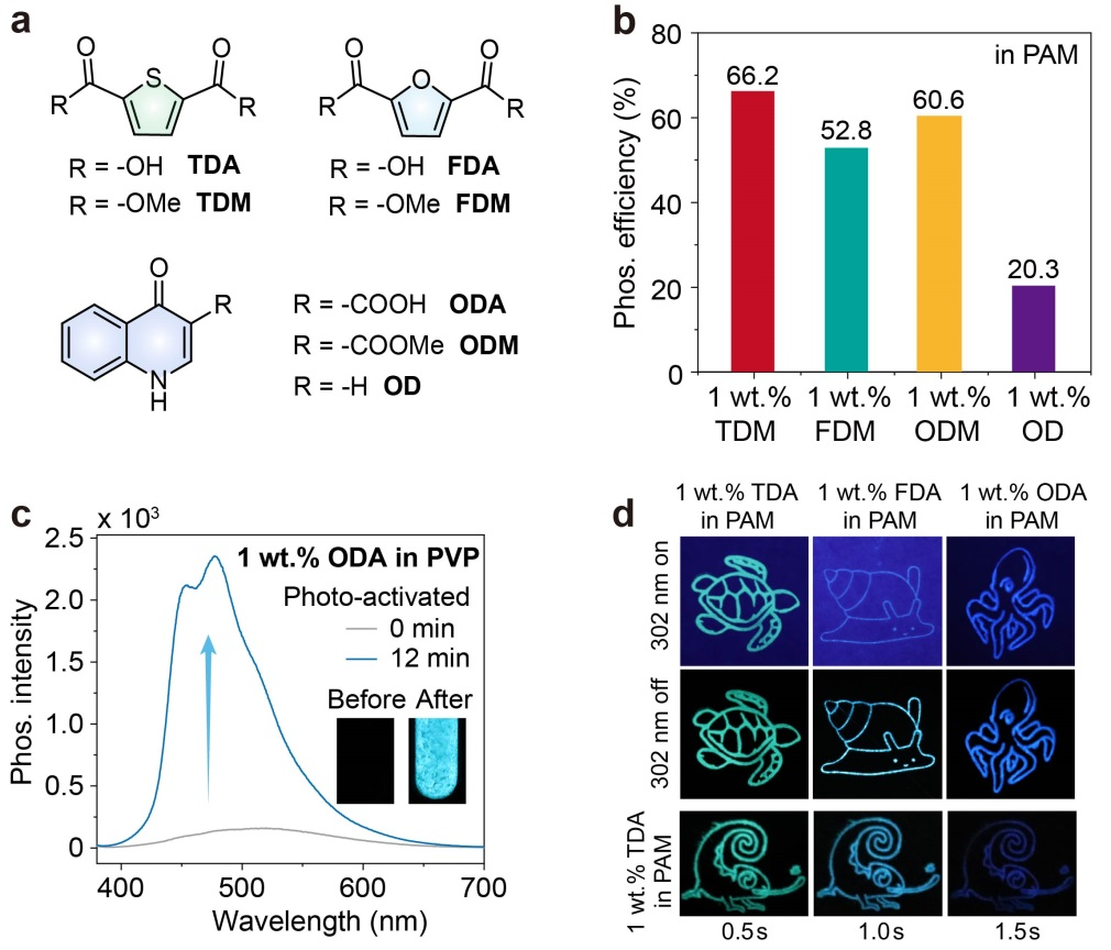 基于此,必一在线平台(中国)官网蔡素芝副教授与西北工业大学黄维院士、南京工业大学安众福教授合作,共同提出一种创新策略:通过将芳香杂环衍生物掺杂到不同聚合物中,成功实现了高效率和光激活室温磷光。值得注意的是,与粉末状态相比,这些客体分子在聚丙烯酰胺、聚乙烯醇和聚丙烯酸中的磷光效率均显著提升,室温下绝对磷光效率最高可达66.2%。理论计算与对照实验表明,这种高效磷光源于促进系间窜越与降低非辐射跃迁的协同增强效应。有趣的是,当芳香杂环衍生物掺杂到聚(N,N-二甲基丙烯酰胺)或聚乙烯吡咯烷酮中时,经紫外光激活后磷光强度与寿命均急剧增加,其中,掺杂1 wt.%芳香杂环衍生物的聚乙烯吡咯烷酮薄膜的磷光寿命从1.2 ms延长至578.6 ms。此外,芳香杂环衍生物掺杂的聚丙烯酰胺粉末表现出时间依赖性多色超长室温磷光发射,余辉颜色从亮绿色渐变至深蓝色。通过改变客体分子,可实现深蓝到绿色的多色高效室温磷光发射。基于高效、多色发射与光激活特性,这些主客体体系已成功应用于多色显示和高级信息存储领域,为开发基于相同客体的高效率和光激活室温磷光聚合物奠定了理论基础。该工作以“Host-Dependent Tunable Phosphorescence Based on Aromatic Heterocyclic Derivatives: Highly Efficient and Photo-Activated Ultralong Organic Phosphorescence”为题发表在《Advanced Materials》上。