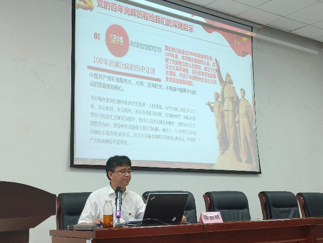 在党史知识讲座中,体科院党委书记陈振祯围绕没有共产党就没有新中国没有共产党就没有社会主义中国没有共产党就没有中国特色社会主义党的百年光辉历程带给我们的启示4个方面进行了深入阐述,并通过播放党史微视频《从红船到巨轮》《习近平讲述的故事|“半条被子”的温暖》生动展现党的历史进程和党员故事。