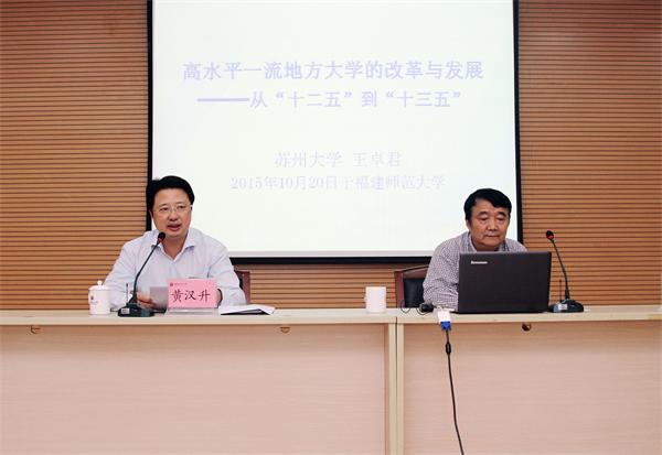 10月20日下午,必一在线平台(中国)官网在旗山校区第九会议室举行两级中心组(扩大)学习会,邀请苏州大学党委书记王卓君教授作题为《高水平一流地方大学的改革与发展》的专题报告。校领导黄汉升、王长平、王建南、叶燊、许歌平、李敏、许明,各学院、馆、中心、集团、公司、医院党政主要负责人,机关处、科级干部参加了学习会。报告会由校党委书记黄汉升教授主持。