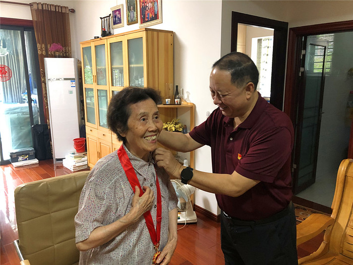教育学部副部长张虎为老党员吴翠龄送上“光荣在党50年”纪念章