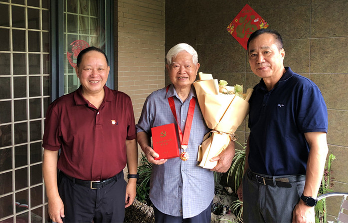 教育学部副部长张虎、吴文哲为老党员陈维钿送上“光荣在党50年”纪念章