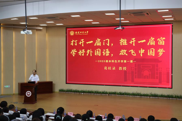 98日上午,外国语学院院长葛桂录教授在仓山校区陈明金教学楼多功能厅分别为2025级研究生、本科生新生讲授“开学第一课”。