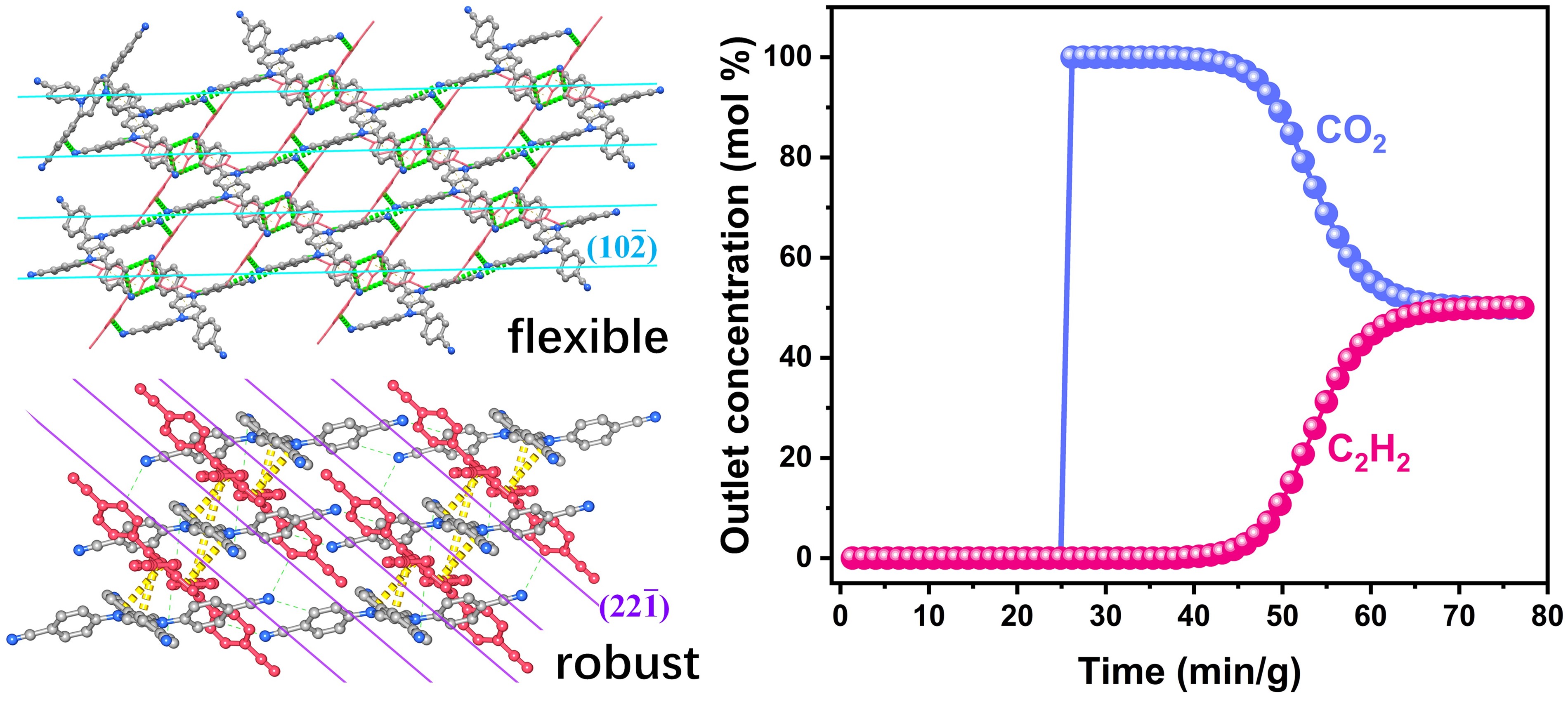 )晶面具有柔性。活化后,HOF-FJU-8a框架表现出明显的刚柔并济的孔结构特征。其刚柔并济的特性使得HOF框架表现出对C2H2和CO2差异性的自适应性吸附和亲和力,从而实现乙炔和二氧化碳混合物的有效分离。该成果以题为“Sticked-layer Strategy to a Flexible-robust Hydrogen-bonded Organic Framework for Efficient C2H2/CO2 Separation”发表于中国化学会旗舰期刊《CCS Chemistry》。