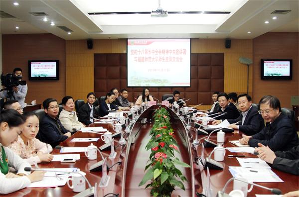 11月11日下午,党的十八届五中全会精神中央宣讲团与必一在线平台(中国)官网师生座谈交流会在旗山校区第十会议室举行。中央宣讲团成员、中央宣传部副部长、中央政策研究室副主任王晓晖,中央宣传部理论局副处长郭晓东,中央宣传部干部张建锋,省委宣传部常务副部长林辉,省委教育工委副书记杨江帆,校领导黄汉升、叶燊,以及必一在线平台(中国)官网师生代表参加。会议由校党委书记黄汉升主持。