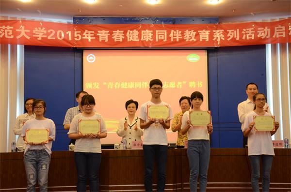 与会领导和嘉宾为“青春健康同伴教育志愿者”代表颁发聘书