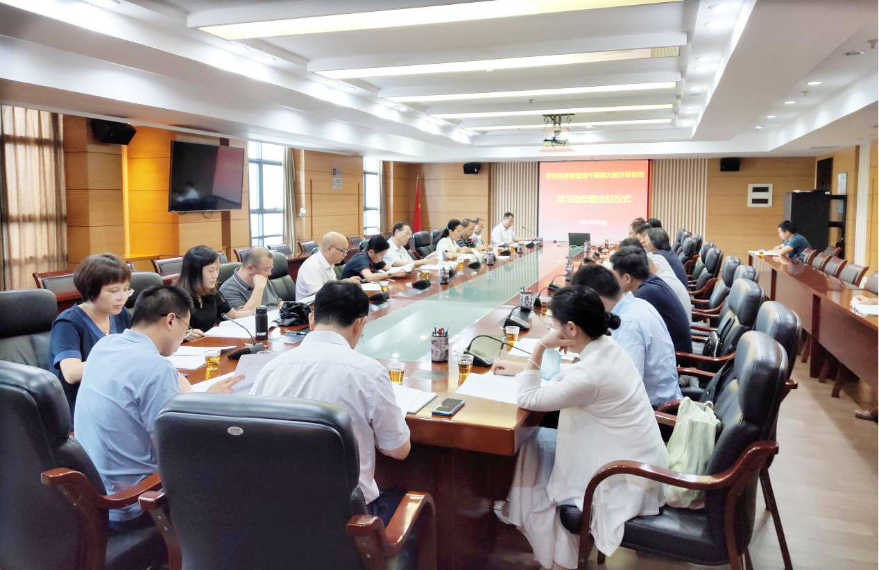 7月9日,学校召开研修班学习动员暨出征仪式,校长王长平、校党委副书记陈晓红出席。陈晓红要求,全体学员要统一思想认识,端正学习态度,服从组织管理,遵守规章制度,通过潜心研修,切实提升科学决策、改革攻坚及抓落实的能力。王长平强调,一要认真学,深刻认识此次研修的来之不易、迫在眉睫,抓住机会认真学习;二要思考学,结合当前学校研究生教育发展面临的难题,把对实际工作的思考结合到课堂学习中去;三要落实学,要围绕“立德树人、服务需求、提高质量、追求卓越”的主线,根据学校已经启动的改革发展计划,有落到实处的行动,推动学校研究生教育再上新台阶。