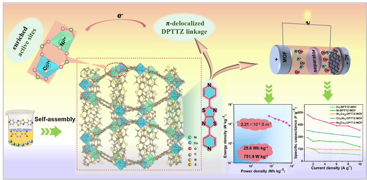 必一在线平台(中国)官网海峡柔性电子(未来科技)学院石乃恩教授,联合韩敏教授、邱盟峯副教授设计合成了一系列基于线性π共轭噻唑配体2,5-双(4-吡啶基)噻唑并[5,4-d]噻唑的3D双金属导电MOFs,它们由线性π共轭噻唑连接体与双金属镍钴节点构成,通过常压条件下简单的双重缩合反应及常规溶剂热合成工艺即可便捷制备。Ni₃Co₁-DPTTZ-MOF实现了高效的键间电子传输,并构建了独特的通道环境增强电解质的渗透能力,且通过调控本征电子结构促进了电子快速传输。在室温下导电率达到2.21×10–3 S m–1,显著超越单金属MOFs材料,并优于许多已报道的三维导电MOFs。综合DFT分析证实,导带中的p型轨道成分几乎全部来自MOFs中的π共轭配体,且镍掺杂促进了自由电子激发并提高载流子密度,有效提升了MOFs的电导率,从而实现优异的比电容性能。这些发现将为3D c-MOFs材料的设计开辟一条新的途径,并推动其在未来电子器件与储能设备中的进一步发展。相关研究成果以“Enhanced Conductivity and Energy Storing Performances of 3D Bimetallic Conductive Metal-Organic Frameworks Based on Linear π-Conjugated Thiazole for Supercapacitors” 为题, 在线发表于中科院一区TOP期刊国际学术刊物——《Chemical Engineering Journal》上。