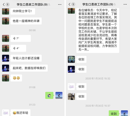 学院党政领导班子成员一直坚守岗位、靠前指挥,始终将学院师生的生命安全与身体健康放在第一位,通过电话、网络等多种方式密切联系师生,时刻关注师生的身体健康与思想动态,认真做好值班值守、信息报送、宣传引导、舆情监控等工作。